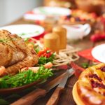 Roast turkey with garnish and pie on festive table